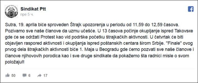 Најављено је да ће сутра окупљање бити у 12 сати, испред Главне поште, како би учесници протеста дали подршку радницима Поште који сутра организују штрајк упозорења.