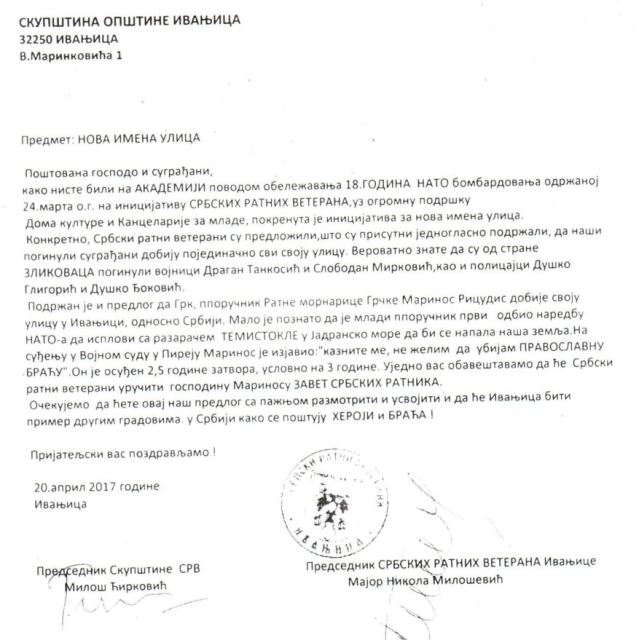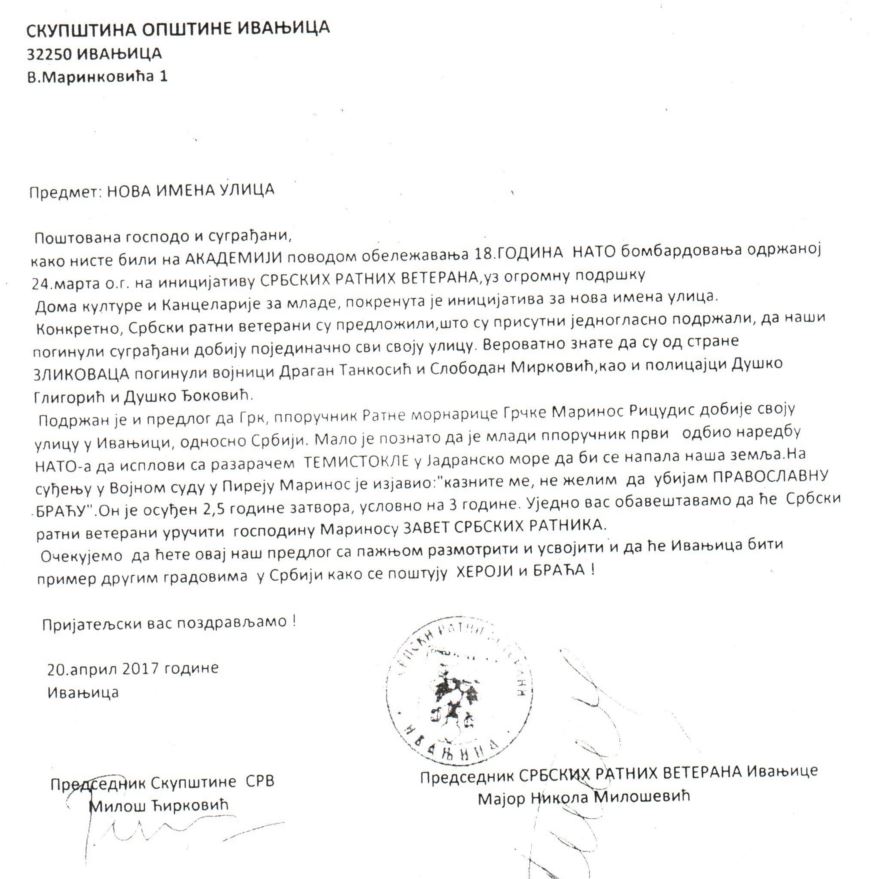 Уједно је предложено да своју улицу у Ивањици добије и Грк поручник Маринос Рицудис јер, истичу да није познато да се наша држава на неки начин захвалила том човеку – његов поступак као да се крије, вероватно због НАТО ЗЛИКОВАЦА.