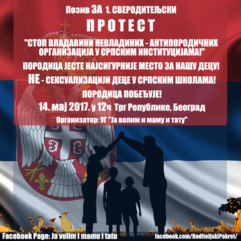 Да бисмо са овом претњом по безбедност наше деце упознали што већи број породица, одлучили смо да организујемо Велики сверодитељски протест упозорења, који ће бити одржан на Тргу републике у Београду, 14. маја, од 12 часова. Позивамо вас да нам се тога дана прикључите како бисмо заједно показали колико смо јаки, колико морамо да се питамо и колико нећемо толерисати скрнављење наших породичних вредности, наше духовне баштине и наших предања!