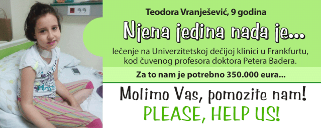 Драги пријатељи знани и незнани, људи добре воље и племенитог срца, молимо Вас, учинимо све да помогнемо слаткој и драгој Теодори. Потребно је да у најкраћем року (10 дана) сакупимо велики износ новца за Теодорино лечење. Апелујемо на Вас, ваше пријатеље и родбину да нам помогнете у прикупљању новца за њено лечење јер нам је то једина нада.