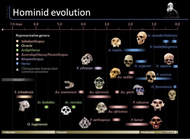 – Човек, homo sapiens, настао је пре 30.000 до 100.000 година? Фосили заједничког претка мајмуна и човека, односно прелазне врсте према човеку, нису пронађени. Највише спекулација, контроверзи, маште, заблуда, фалсификата и лажи има у вези фосила хоминида, наводних директних предака човека. Разне скице, макете, модели хоминида и филмови, које обилато користе еволуционисти, нису никакав научни доказ, већ искључиво машта појединих еволуциониста. Прецизна конструкција хоминида на основу дела кости је немогућа, поготово је немогуће конструисати мека ткива, кожу, длаку, очи, лице. Пронађени делови скелета појединих хоминида су скоро идентични скелету мајмуна, па је могуће да су ти наводни хоминиди били нека од бројних изумрлих врста мајмуна. Homo ergaster и homo erectus наводно су најближи преци човека, homo sapiens-a. На основу дела скелета, бројних контроверзних података, цртежа, модела, филмова, као и на основу процене обима и облика лобање и величине мозга (није битна само величина мозга, већ и анатомска структура мозга и сложеност можданих мрежа и синапси), немогуће их је реално конструисати и упоредити са човеком, поготово ако имамо на уму варијетете савременог човека. Веома контроверзни су и подаци о неандерталцу. Ако су хоминиди живели у периоду који наводе еволуционисти, онда је већина хоминида живело у истом периоду. Ко је онда од њих коме предак, и колико предака има човек?