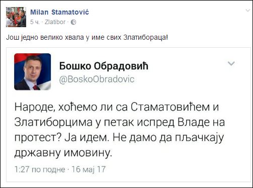 – „Заборавном“ Министарству грађевине, саобраћаја и инфраструктуре уручићемо списак десетина и десетина килограма докумената које смо, свих ових година, предали тој адреси ради добијања грађевинске дозволе за нашу гондолу. Потом ћемо, за све наше захтеве, глувој Вучићевој Влади предати и званични приговор на покушај беспризорног отимања више од трећине територије општине Чајетина, под фирмом формирања „Парка природе“, а на крају ћемо у Немањиној предати и захтеве за смену министарке Михајловић, али и министарке правде Неле Кубуровић и министра пољопривреде и животне средине Бранислава Недимовића због саучесништва у овом специфичном „правном“ терору против нас Златибораца – рекао је Стаматовић, постављајући питање да ли је крајњи циљ Вучићевих тврбухозбораца из Владе да натерају Златиборце на колективно иселење да би се, од Бога дати, природни ресурси Златибора поклонили мистериозним арапским инвеститорима који се презивају на „ић“ и њиховим пајтосима, „комплетним идиотима из врха власти у Београду“.