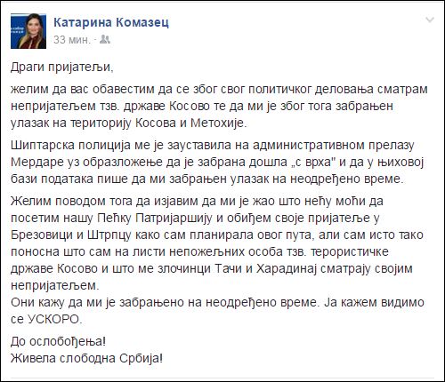 „Због свог политичког деловања сматрају ме непријатељем тзв. државе Косово, те ми је због тога забрањен улазак на територију Косова и Метохије. Жао ми је што нећу моћи да посетим нашу Пећку Патријаршију и обиђем своје пријатеље у Брезовици и Штрпцу, како сам планирала овог пута, али сам исто тако поносна што сам на листи непожељних особа тзв. државе Косово и што ме злочинци Тачи и Харадинај сматрају својим непријатељем“, изјавила је она.