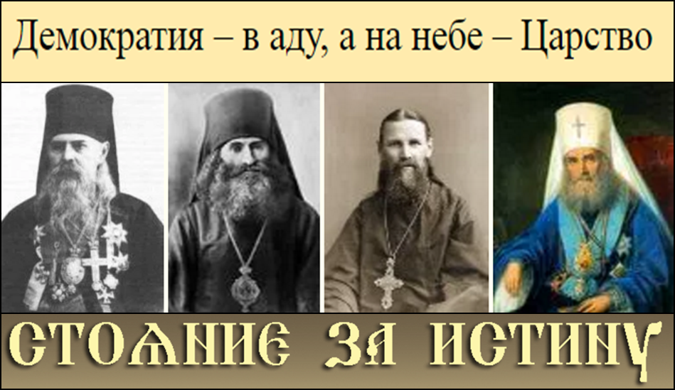 „Свепогубно је управљање многих: ‘Један да буде Цар’- каже древни мудрац… Присталице демократије желе (изворно: хране пожуду) уставно или републиканско управљање у Русији, али они не разумеју историју и карактер руског народа… Умукните ви, сањалице конституционализма и парламентаризма. Одступи од мене, сатано … “
