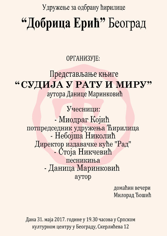 позивамо Вас на представљање књиге „Судија у рату и миру“ аутора Данице Маринковић, дана 31. маја 2017. у 19:30 часова, Српски културни центар, Београд, Скерлићева 12.