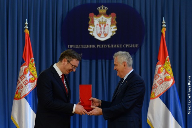 Досадашњи председник Томислав Николић сачекао је Вучића на улазу у зграду на Андрићевом венцу. Николић му је у свечаној сали, симболично, предао државни печат који се ставља на акте које потписује председник и председничку стандарту.