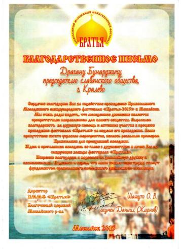 Захвалница организатора фестивала „Браћа“ председнику Словенског друштва, 2015.
