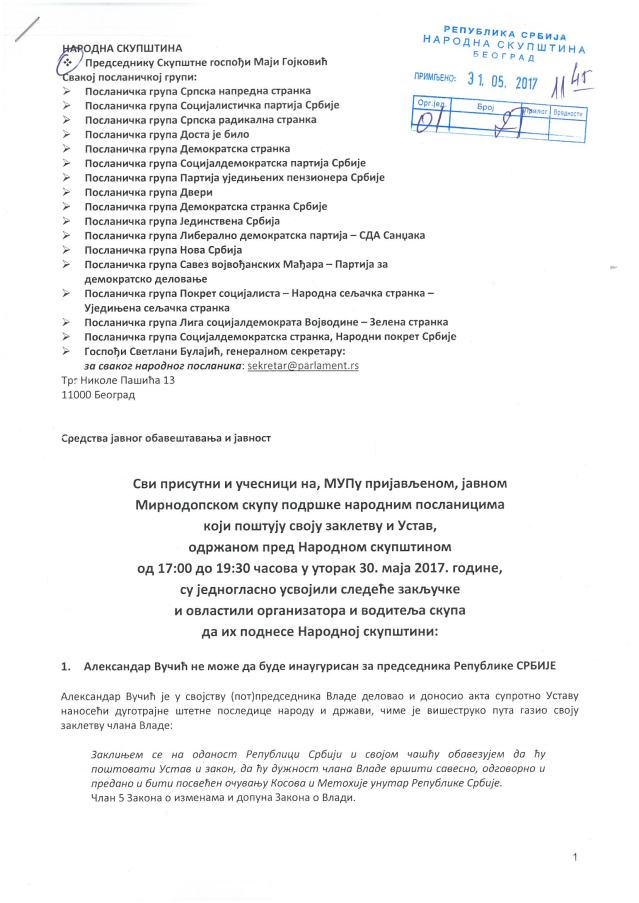 Сваки народни посланик који прихвати заклетву и инаугурисање Александрра Вучића за председника Републике делује против Устава, одбацује и гази своју посланичку заклетву, губи легитимитет народног посланика и не може више да учествује у реду Народне скупштине.