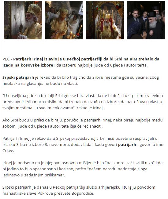 Били смо сведоци да су српске власти радиле на организацији, митинзима и јавним позивима на издају, на претходним шиптарским изборима које је расписала Јахјага, чак је и патријарх СПЦ 2013. из порте Пећке Патријаршије Србе позвао на шиптарске изборе... Та огољена издаја људи у политичкој и духовној власти (која би требала да брине, чува и води рачуна о народу и држави) – буквално шокира својом дрскошћу!