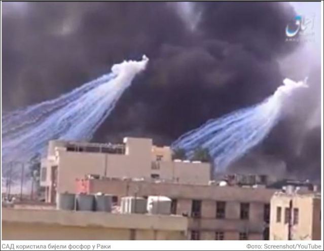 На Ју Тјубу су се појавили снимци ваздушног напада авијације коалиције предвођене Америком на циљеве у Раки, Сирији. Реч је о употреби белог фосфора од чијег дејства страдају и цивили који се налазе у том граду.