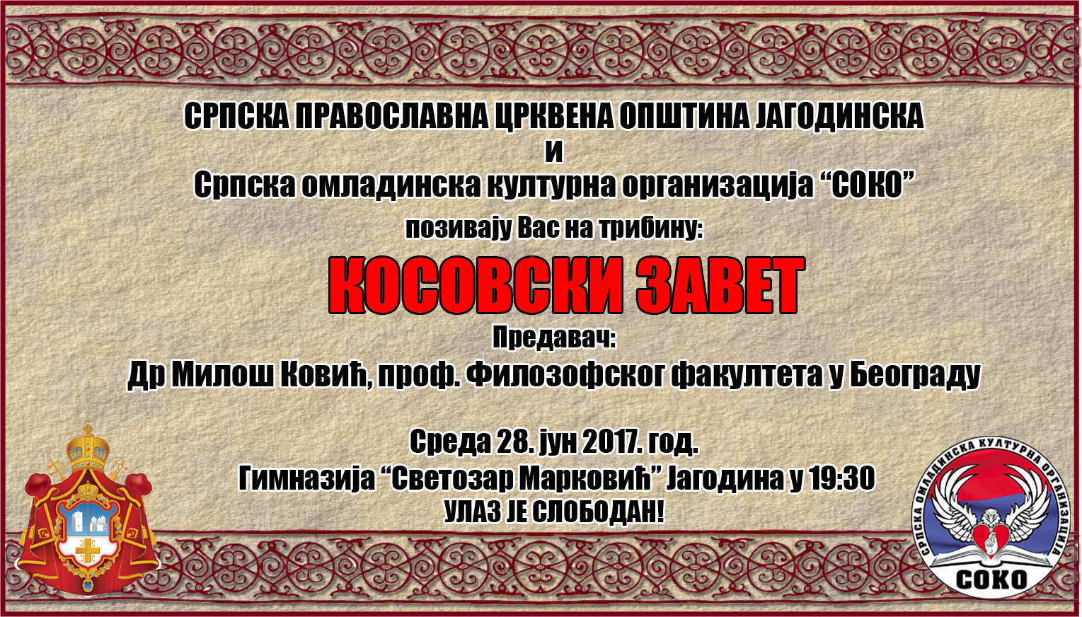 Проф. др Милош Ковић, један од најбољих српских историчара средње генерације, 28. јуна, на Видовдан, одржаће у Јагодини трибину: „Косовски завет“.