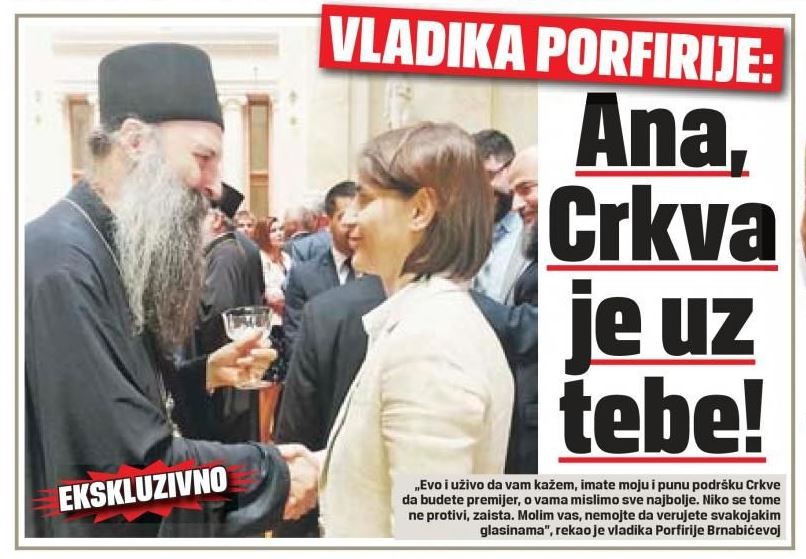 Другом приликом подршку Ани Брнабић исказао је митрополит Порфирије. У медијима је осванула фотографија срдачног сусрета дотичног митрополита са новом премијерком, уз коју медији додају вест да јој је том приликом упутио пуну подршку. С обзиром да се митрополит до данашњег дана није оградио од оваквих медијских извештаја, нити демантовао објављено, остаје само једини логички закључак, а то је: да су медији, на жалост, у праву.