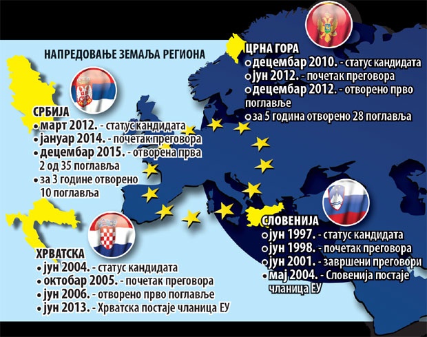 Евидентно је да је после пријема Хрватске у ЕУ 2013. знатно успорен преговарачки процес, а у српске точкове европског пута убачен је још један додатни клип који немају друге земље – нормализација односа са Приштином. Од напретка у дијалогу зависи отварање сваког поглавља, па је тако Србија, од почетка преговора 2014, односно за три године, отворила 10 поглавља. Уколико би Србија наставила овим темпом, то би могло да потраје још минимум пет-шест година. Кад се на то додају још две године, колико је у просеку потребно да државе ЕУ ратификују уговоре о пријему овом динамиком, Србија неће ући у ЕУ пре 2025.