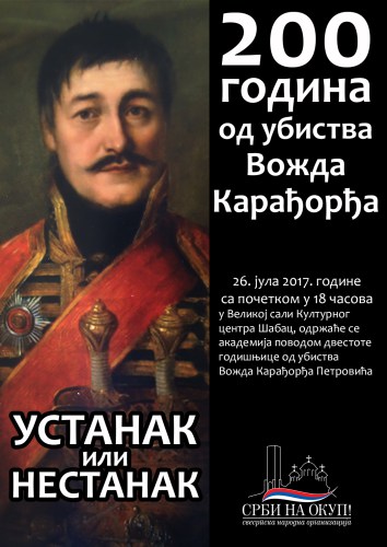 У среду 26. јула, са почетком од 18 часова, у Великој сали Културног центра Шабац, одржаће се академија поводом двестоте годишњице од убиства Вожда Карађорђа Петровића.
