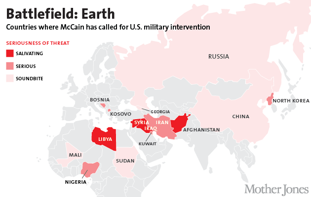 Овај зли човек је подржао свако америчко војно крвопролиће у свом непристојно дугом животу, и активно је учествовао у промовисању и прибављању подршке за сваки одвратни акт у режији војске током читаве своје каријере. Чланак у часопису Mother Jones из 2013… под насловом „Мапа: све земље које је Џон Мекејн хтео да нападне“, описује како се Мекејн свесрдно залагао за војне ескалације чак и у земљама које нису биле на мети незасите америчке војне машинерије.