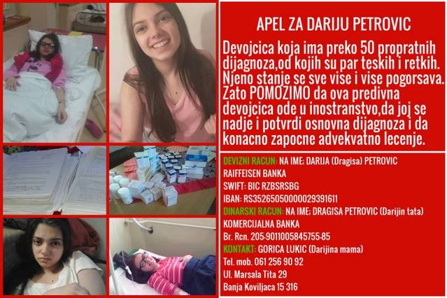 Због погоршања стања, а и предлога да се пошаље у иностранство, Даријина мама је контактирала дијагностичке центре у иностранству, али недостатак новца спречава Дарију да оде и да коначно после 16 година добије праву дијагнозу. Сви дијагностички центри су послали предрачуне и цена је између 20 000 и 30 000 евра са свим испитивањима, боравком, авионским картама.