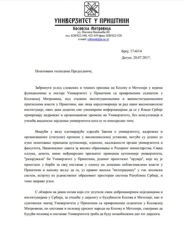 Обраћам Вам се у име целокупне академске заједнице Универзитета у Приштини са привременим седиштем у Косовској Митровици која је узнемирена информацијама да се без консултација и учешћа академске заједнице Универзитета у Влади Републике Србије припремају кадровске и организационе промене на Универзитету, што је у супротности са Уставом Републике Србије и Законом прокламованом институционалном аутономијом Универзитета.
