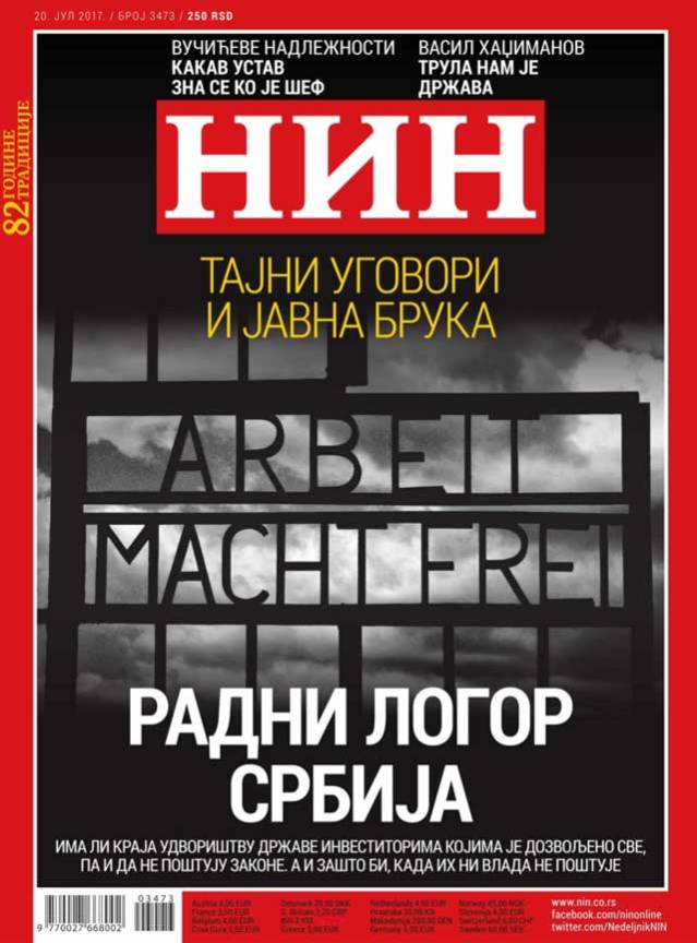 Данас је изашао нови број НИН-а, а на насловној страни налази се фотографија нацистичког логора са натписом “Arbeit macht frei“ (Рад ослобађа) и насловом “Радни логор Србија“. Насловна страна прати текст у коме се говори о односу државе и инвеститора где је, како се наводи „инвеститорима дозвољено све, па и да не поштују законе“.