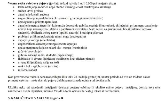 Ако је веровати резултатима досадашњих истраживања белгијског произвођача GlaxoSmithKline, од вакцине “EngerixB” (која се и даље тестира на најмлађој популацији), у свакој генерацији вакцинисане деце у Србији, њих двадесеторо “потенцијално” оболи од неуропатије, као последице “веома ретког нежељеног дејства” ове вакцине.