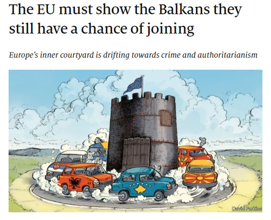 Године 2003. су балканске земље рекле да њихова будућност лежи унутар Европске уније. До данашњих дана су наде Србије и још пет кандидаткиња (Албанија, Босна, Косово, Македонија и Црна Гора) избледеле попут звездица на Цвијићевој застави. Изнурене у бескрајним редовима на политичком путањама Балкана, изгледају прегорело попут Бугарске и Румуније које су прерано примљене 2007. године, па Европљани немају жеље да и даље проширују свој клуб, нарочито сада кад их Брегзитобавезује да се сналазе у сопственом сажимању. Године 2014. је председник Европске комисије Жан Клод Јункер рекао да током његовог петогодишњег мандата неће бити проширeња и тај његов бесмислени гест је везао руке балканских реформатора. Данас тек 43% Срба жели да се придружи ЕУ, то је пад са 67% колико је било 2009. године. Млади су значаjно непријатељски расположени.