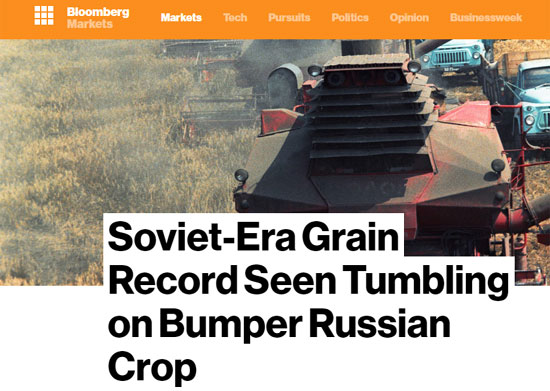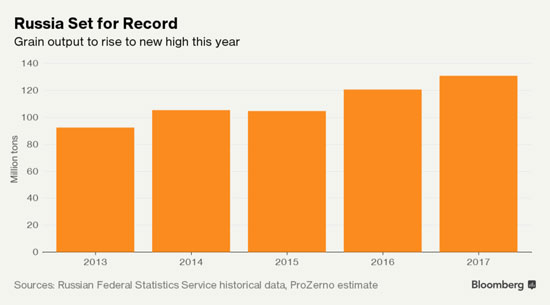 Ове године ће жетва досегнути целих 130,7 милиона метричких тона житних и кукурузних усева, рекао је Владимир Петриченко, директор московске аналитике Про-зерно. То ће изгурати производњу 2,6 посто више од ранијег врхунца из 1978. године, уочи совјетске инвазије на Авганистан под влашћу Леонида Брежњева.