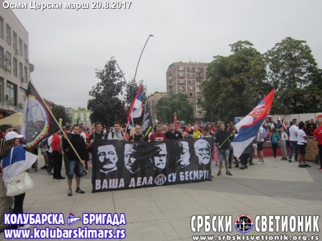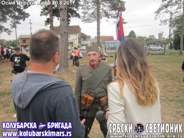 Већ када смо прилазили споменику развијен је наш велики транспарент КОЛУБАРСКА БРИГАДА кога су држали Владан, Раде, Станко, Света, Никола, Иван, Ратко и ја… а испред су стали Алимпије, Зоки, Мића са три барјака. Лука је снимао. Тако смо и дошли до споменика Церским јунацима из 1914. године… Заузели смо нашу позицију лево од споменика, онако како смо се већ договорили са Шабчанима. Извадили смо и наш транспарент са пет војвода и ставили испред нас. По први пут су и Шабчани на Церском маршу развили свој велики транспарент.