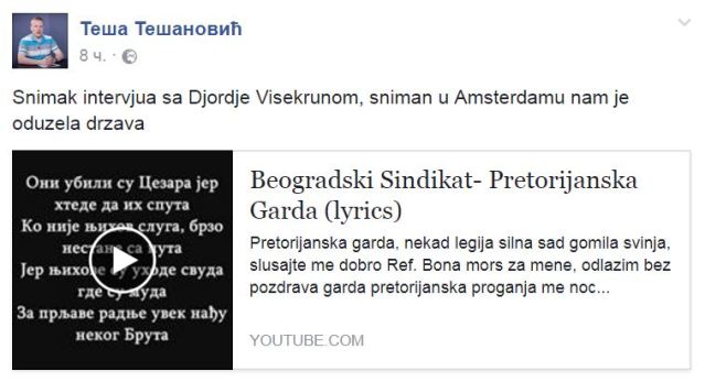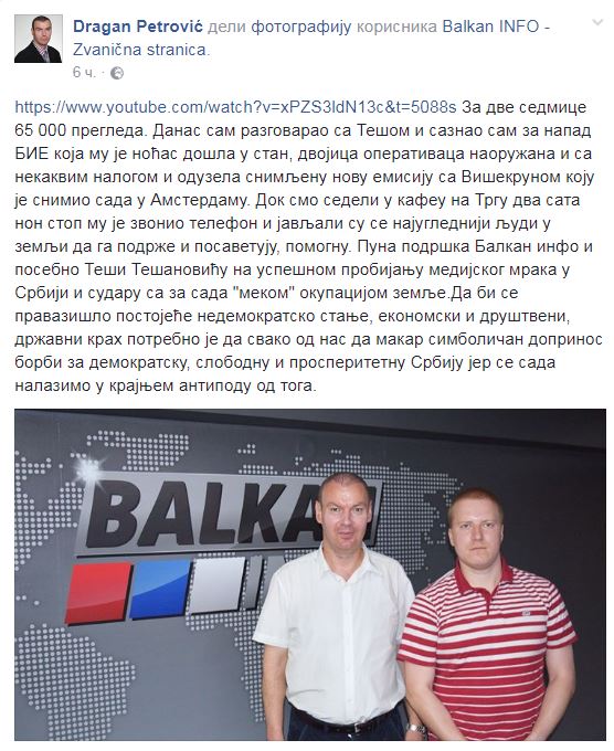 Изражавамо подршку наше редакције колеги Теши Тешановићу и продукцији Балкан ИНФО који су се нашли на удару режима због најновијег интервјуа са Ђорђем Вишекруном. (у прилогу објављујемо транскрипт првог интервјуа са Вишекруном од 25. маја ове године, који је постигао огромну гледаност).