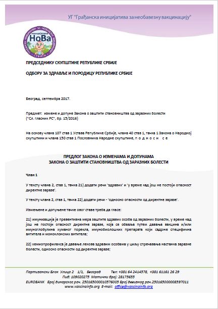 Предлагач измена је удружење родитеља “Грађанска иницијатива за необавезну вакцинацију” које је уз помоћ правних експерата сачинило текст Предлога, уз темељно и опсежно ОБРАЗЛОЖЕЊЕ (ОВДЕ).