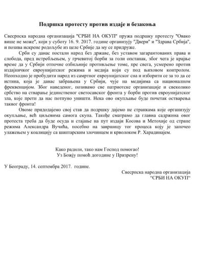 Свесрпска народна организација “СРБИ НА ОКУП“ пружа подршку протесту ‘‘Овако више не може“, који у суботу 16. 9. 2017. године организују “Двери“ и “Здрава Србија“, и позива искрене родољубе из целе Србије да му се придруже.