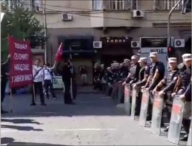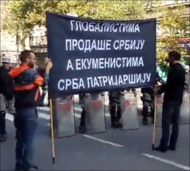 „Испред цркве Светог Марка, предвођени монахом Антонијем неколико десетина верника изашло је на улицу. Они певају православне песме и носе транспаренте против екуменизма и содомије у нашој окупираној Србији у којој се врши дискриминација над већином народа, над породичном, традиционално православном традицијом. Окружују их полицијске снаге, а чува их Господ Бог.“ – СРБски ФБРепортер