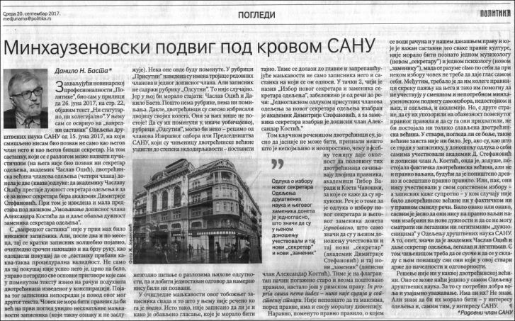 Захваљујући новинарској професионалности „Политике“, био сам у прилици да 26. јуна 2017, на стр. 22, објавим текст „Ни статутарно, ни колегијално“. У њему сам се осврнуо на „ванредни састанак“ Одељења друштвених наука САНУ од 15. јуна 2017, на који смишљено нисам био позван не само као његов члан него и као његов бивши секретар. На том састанку, који се с разлогом може назвати пучистичким (на њега није био позван ни секретар Одељења, академик Часлав Оцић), двотрећинска већина чланова Одељења донела је две (квази)одлуке: да академику Чаславу Оцићу престаје дужност секретара Одељења и да се за новог секретара бира академик Димитрије Стефановић. При том је изведена и мала представа под називом „Умољавање дописног члана Александра Костића да и даље обавља дужност заменика секретара Одељења“.
