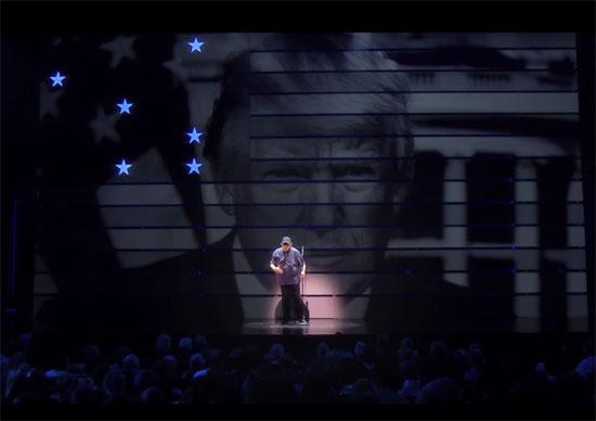 Оне вечери кад сам гледао Мурову представу, његова „таши-таши-танана“[8] публика уверавала је саму себе да представља „већину“ и позивала на „свргавање Трампа, лажова и фашисте“. Изгледа је Мурова порука била да је требало запушити нос и гласати за Хилари Клинтон како би живот наставио да буде известан.