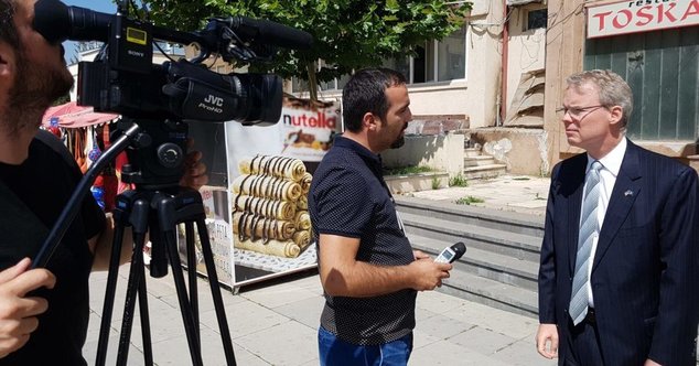 | Представник илегалне америчке канцеларије, тзв „амбасаде“, на Косову и Метохији са шиптарским новинарима |