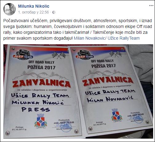 Јованa Мрдака, Јeep Club Србија из Београда, није баш послужила срећа на off road релију Пожега 2017., будући да је први дан имао ситних проблема на стази, а други дан незгоду на Чирокију, популарној „коцкици“ када се откачио лежај на предњем десном точку, те није успео са заврши брзинац, али то није умањило његово добро расположење: