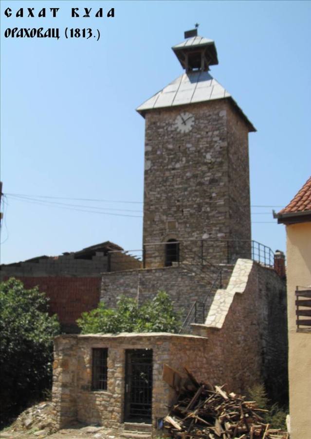 Сахат кула је изграђена на остацима старог града – „Градине“ и представља својеврстан симбол старог дела Ораховца. На Сахат кули је постојало и масивно звоно, које су муслимани из Ораховца 1908.године донели са порушене Сахат куле у Великој Хочи, које је, по предању, даровала кнегиња Милица. Кључеве од Сахат куле су по ослобођењу од ТУрака држале српске продице, које су живеле у њеној непоредној близини и тај обичај преносиле са генерације на генерацију, све до рата 1999.године, када су биле принуђене да се иселе из тог дела града.