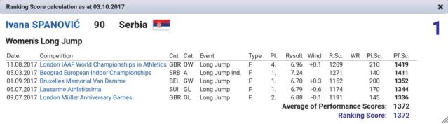 Према рангирању најеминентније статистичке куће када је у питању атлетика „All Athletics“, Ивана Шпановић завршава ову годину на првом месту светске ранг листе са укупно 1372 поена.