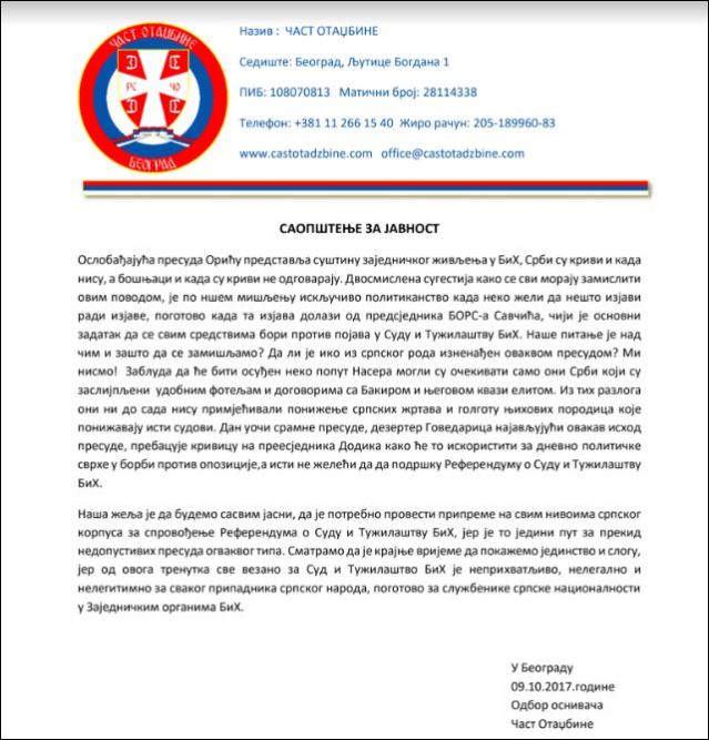 Ослобађајућа пресуда Орићу представља суштину заједничког живљења у БиХ, Срби су криви и када нису, а бошњаци и када су криви не одговарају, наведено је у саопштењу „Част отаџбине“.
