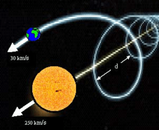 Брзина кретања Сунчевог система око центра галаксије је 250 километара у секунди, а брзина револуције Земље око Сунца је 30 километара у секунди. Земља се око Сунца креће се у облику завојнице, чији је полупречник r = mvsinӨ/qB. Пут који пређе Земља у току једне календарске године у односу на центар галаксије је d = 2πrmvcosӨ/qB, где је B вектор магнетске индукције, a q електрично оптерећење; Ө угао између вектора брзине v и вектора магнетске индукције B.