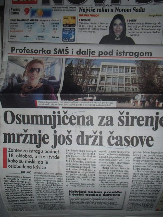 Он ме је упозорио да после писања медија о мени, било какав ексцес који би направили било ђаци наше школе или било који други малолетници у граду Новом Саду, вероватно би био приписан мом утицају на ту децу чак и ако ја немам никакве конкретне везе са том децом, а све зато што су медији објавили тај запис са интернета. За мене је та изјава инспектора била шокантна јер све реакције околине су настале због сензационалистичкох па скоро и хистерично сензационалистичког писања из појединих медија, а не због било каквог мог претходног писања било где.