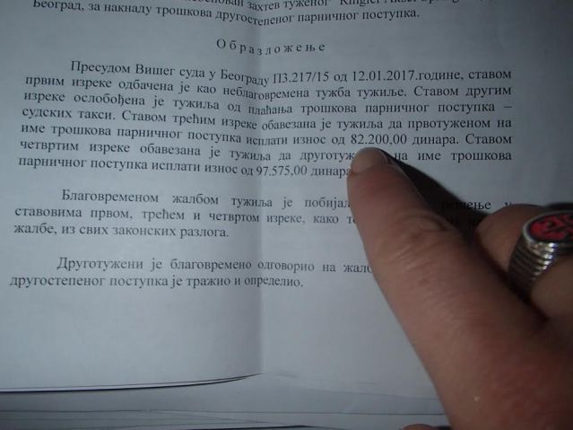 Међутим, оно што нисам очекивала је да моја каснија тужба против медија који су ме веома угрозили буде одбачена и то не само одбачена него одбачена после пар година развлачења процеса, одуговлачења, нагомиланих рочишта ко зна зашто и после свих тих брљотина суда, када су одбацили тужбу, наложено ми је да ја платим судске трошкове тужених медија иако су они извршили насиље нада мном, а не ја над њима. Ти трошкови износе укупно 187 000 динара и да није било развлачења тог судског процеса, они не би били толики јер је тужба могла да се одбаци и у само једном рочишту. Просто ми све то нема смисла и није ми јасно зашто је судија развлачењем у неколико рочишта довела мене ни криву ни дужну у оволике трошкове ако је већ одлучила да одбаци тужбу. Одбацивање тужбе значи да се није ни разматрала уопште, није ништа из моје тужбе медијима оповргавано, једноставно по њој није уопште поступано, нису ни позвани бројни сведоци који би је потврдили нити ишта, само ми је гомилањем рочишта направљен трошак такав какав је, огроман и безразложан.