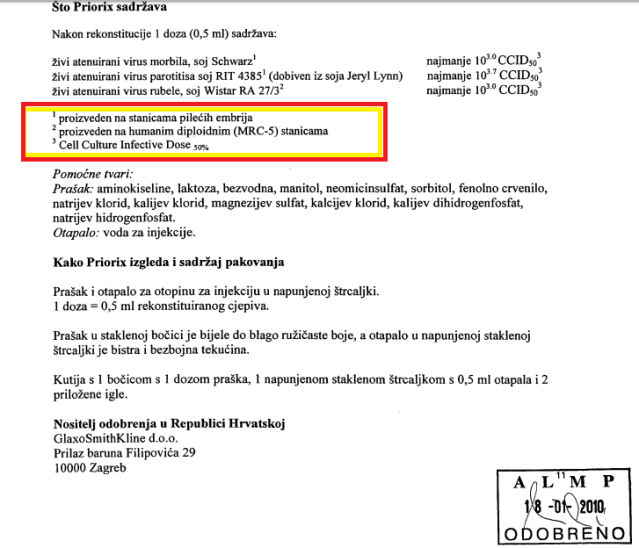 2.“MRC-5 је диплоидна линија ХУМАНИХ ћелија културе састављена од фибробласта изведених из плућног ткива АБОРТИРАНОГ кавкаског МУШКОГ ФЕТУСА СТАРОГ 14 недеља. Линију ћелија је изоловао J.P. Jacobs и колеге у септембру 1966.“