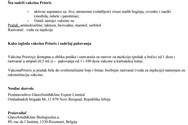 Наиме, следеће две фотографије приказују два упутства за исту MMR „Priorix“ вакцину, белгијског произвођача „GSK“ прва за српско, друга за хрватско тржиште.