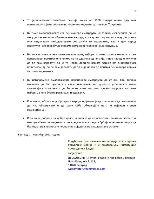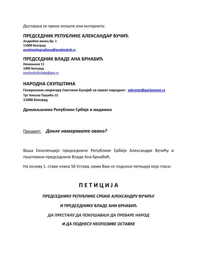 Ваше, народни посланиче, одуговлачење да Вам поштовање Устава Републике Србије и заклетве њеном народу буде неприкосновено важнније од заштите Александра Вучића да се на њега примени Устав Републике Србије сваког трена само повећава и продубљује пропадање наше државе и нашег народа. Зато, а на основу чланова 1-3 и 1. става члана 56 Устава, Вам се подноси следећа петиција која се надовезује на петиције /6/ и /7/, тј. ова представља трећи део исте петиције: