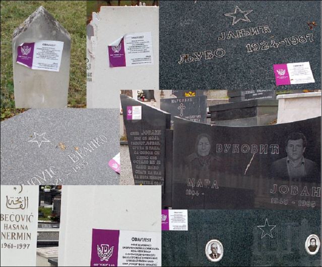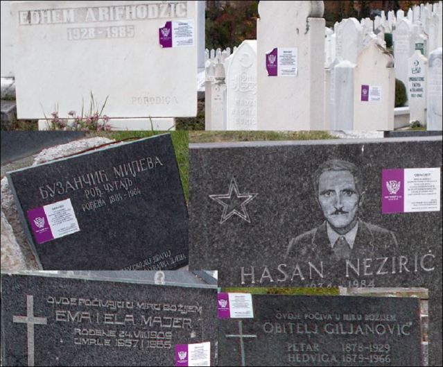 Неки преемотивни и плаховити Срби су добијање опомена које се лијепе на гробове (види слику) схватили као поновно етничко чишћење и недавање ни мртвим на миру да почивају. Па сам ја зато лично усликао неколико примјера таквих гробова са опоменама, али не само србских, има ту и муслиманских, римо-католичких, атеистичких, комунистичких и ко зна каквих све не гробова, да се види да је то општа акција, а не селективна.