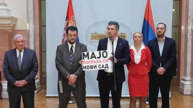 Након подизања плаката са натписом „Мајо, покрала си Нови Сад“ , на седници Административног одбора, Бошку Обрадовићу је одузета реч и без образложења је добио опомену, иако се не зна на коју Мају се односио текст на плакату. Очито су представници власти препознали Мају Гојковић и њену крађу Новог Сада у време док је била градоначелник. Бошко Обрадовић је реаговао постављајући Мартиновићу више питања откуда му право да му искључи микрофон и одузме реч, на шта Мартиновић није имао одговор.