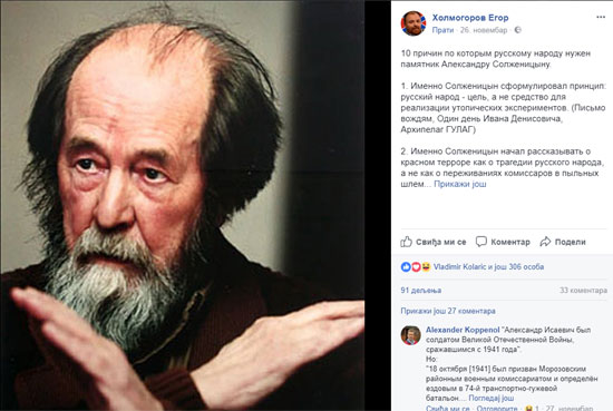 Познати публициста и творац синтагме „руско пролеће“ Јегор Холмогоров на свом Фејсбук профилу набраја десет разлога због којих је руском народу неопходан споменик Солжењицину.