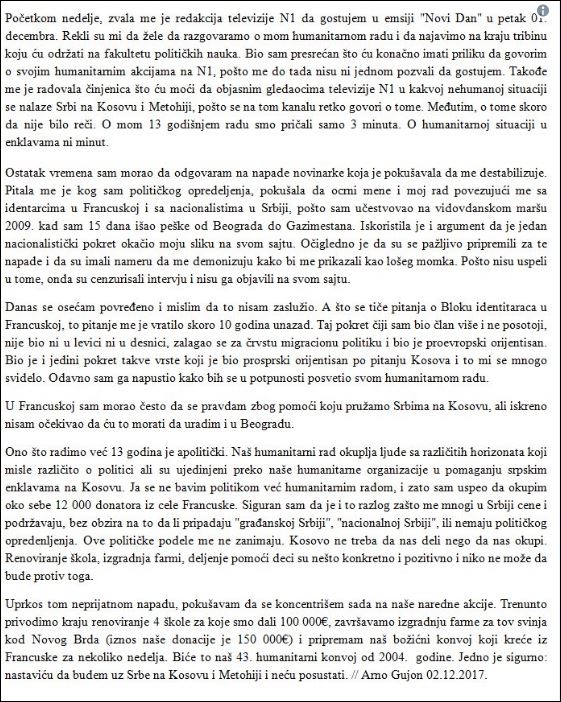 „Почетком недеље звала ме је редакција телевизије N1 да гостујем у емисији „Нови дан“ у петак 01. децембра. Рекли су ми да желе да разговарамо о мом хуманитарном раду и да најавимо на крају трибину коју ћу одржати на Факултету политичких наука. Био сам пресрећан што ћу коначно имати прилику да говорим о својим хуманитарним акцијама на N1, пошто ме до тада нису ниједном позвали да гостујем. Такође ме је радовала чињеница што ћу моћи да објасним гледаоцима телевизије N1 у каквој нехуманој ситуацији се налазе Срби на Косову и Метохији, пошто се на том каналу ретко говори о томе. Међутим, о томе скоро да није било речи. О мом 13-годишњем радо смо причали само три минута. О хуманитарној ситуацији у енклавама ни минут.
