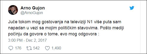Француски хуманитарац Арно Гујон гостовао је у емисији „Нови дан“ на телевизији N1. Иако је био пресрећан због позива, јер никад раније није гостовао на поменутој телевизији, на крају је био јако разочаран пошто је, како каже, све време морао да се правда водитељки.