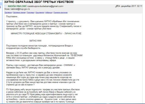 У прилогу – у документу Вам шаљемо ХИТНО обраћање због поновљених претњи убиством као и материјални доказ о претњи – снимак претње и тражимо од Вас да ХИТНО на руке предате министру Стефановићу писмо и материјални доказ – снимак претње убиством