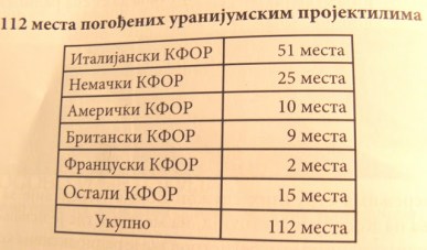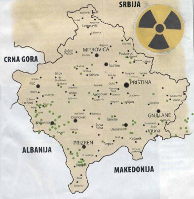 На званичној мапа-карти НАТО-а на Косову и Метохији је равно 112 локација на којима су циљеви гађани осиромашеним уранијумом. Највише пројектила са осиромашеним уранијумом изручено је у Метохији и то западно од пута Пећ – Ђаковица – Призрен. Више од 15 локација погођених муницјом са осиромашеним уранијумом се налази на путу Ђаковица – Зрзе, затим на релацији Дечане – Рзнић – Прилеп- Јуник (више од 10 локација).